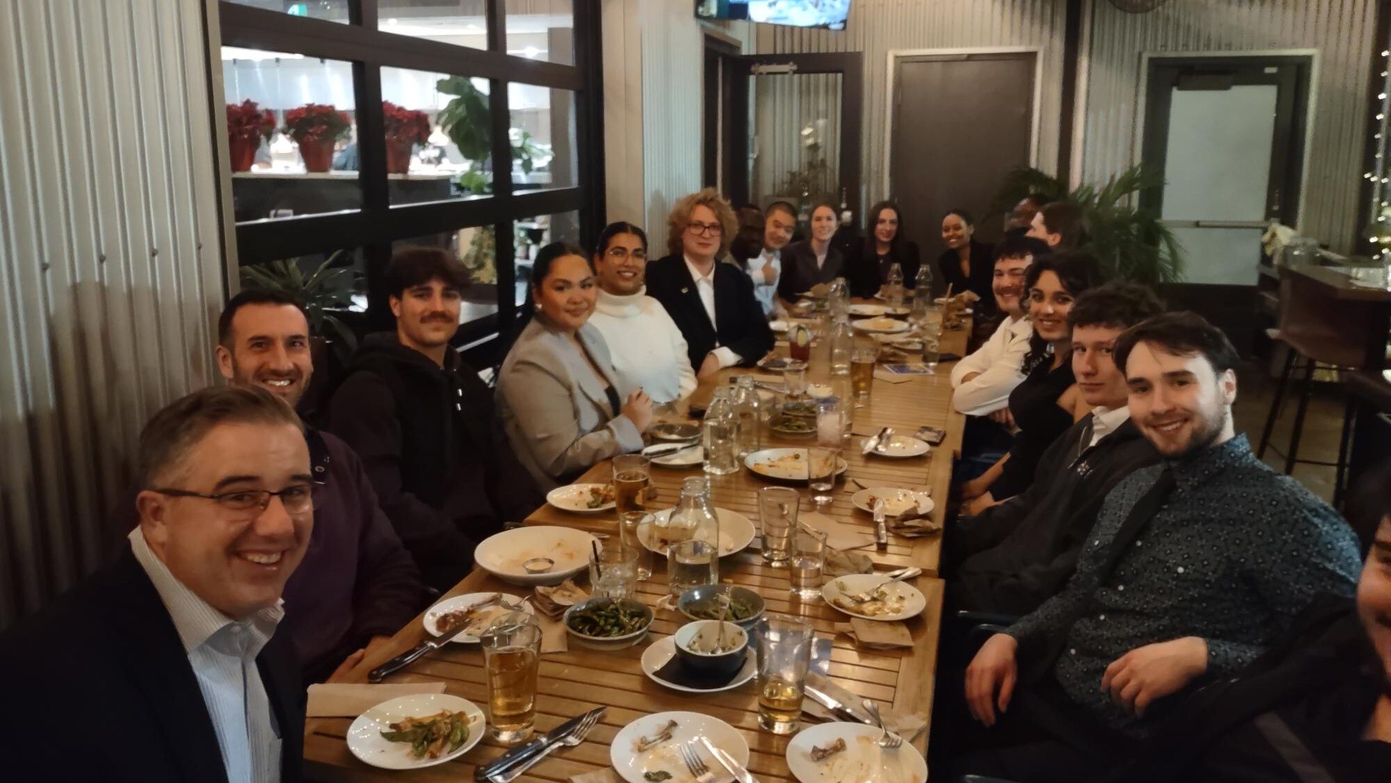Picture of various POLI 3610, mock NATO meeting participants eating after the event. Taken during the Fall 2024 semester in Kamloops, Canada.